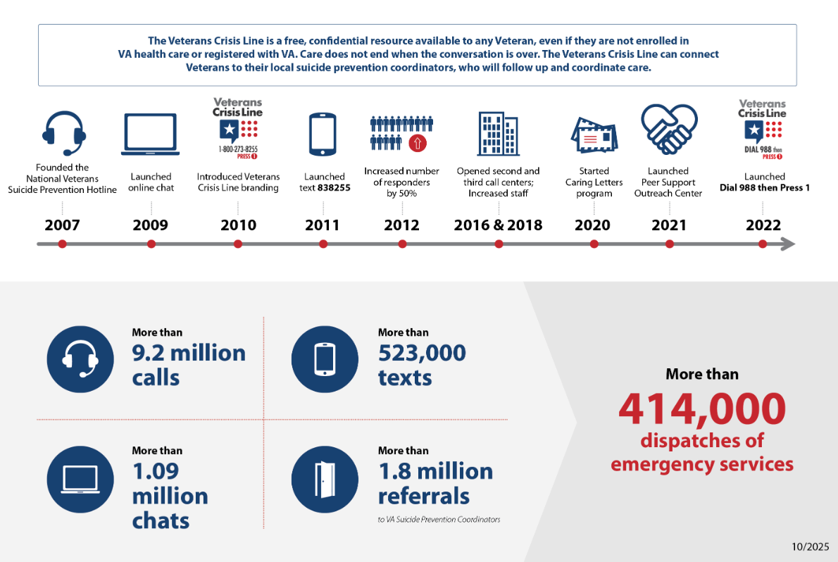!The Veterans Crisis Line offers support 24/7. If you’re a Veteran in crisis or worried about a Veteran, call, chat, or text now.